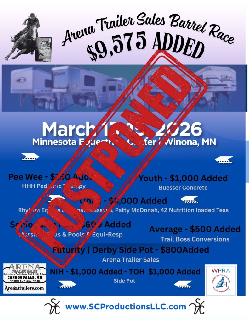 It is with deep regret that we must announce the postponement of this weekend’s Arena Trailer Sales Barrel Racing Event in Winona, MN.