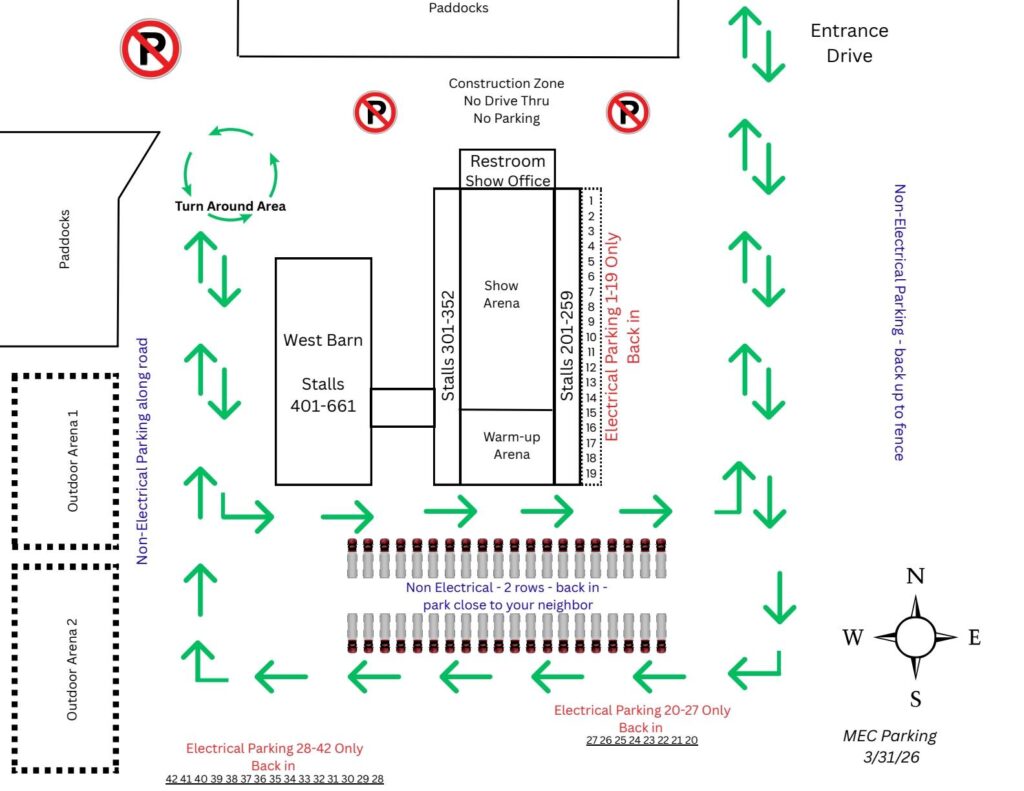 Riders coming for the Day – ALL DAY PARKING – PLEASE, PARK IN THE PASTURE! No tying horses to your trailer if your parked around the arena. We need all the trailers to park close together in the parking lots! Due to the construction in the front of the arena please check out the attached MAP! Early Arrivals can come after 5:00PM – DO NOT ARRIVE BEFORE 5:00 PLEASE!!