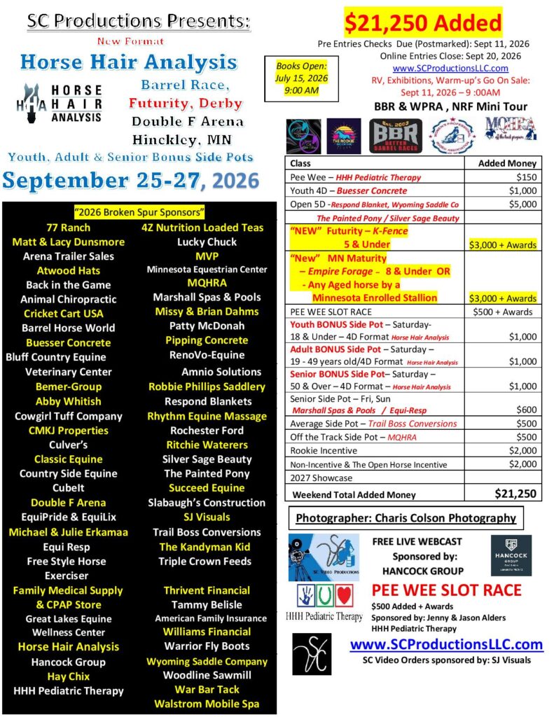 By entering an SC Productions Events, I understand it’s my responsiblity to be familiar with and abide by the rules. SC Productions, Sponsors, event facilities are not responsible for any injury, accidents, loss or theft that may occur to You, Your horse,or Your Property while attending this event either as a spectator or contestant. We DO NOT have Emergency Medical Technicians (EMT’s) on site during any SC Productions Events.