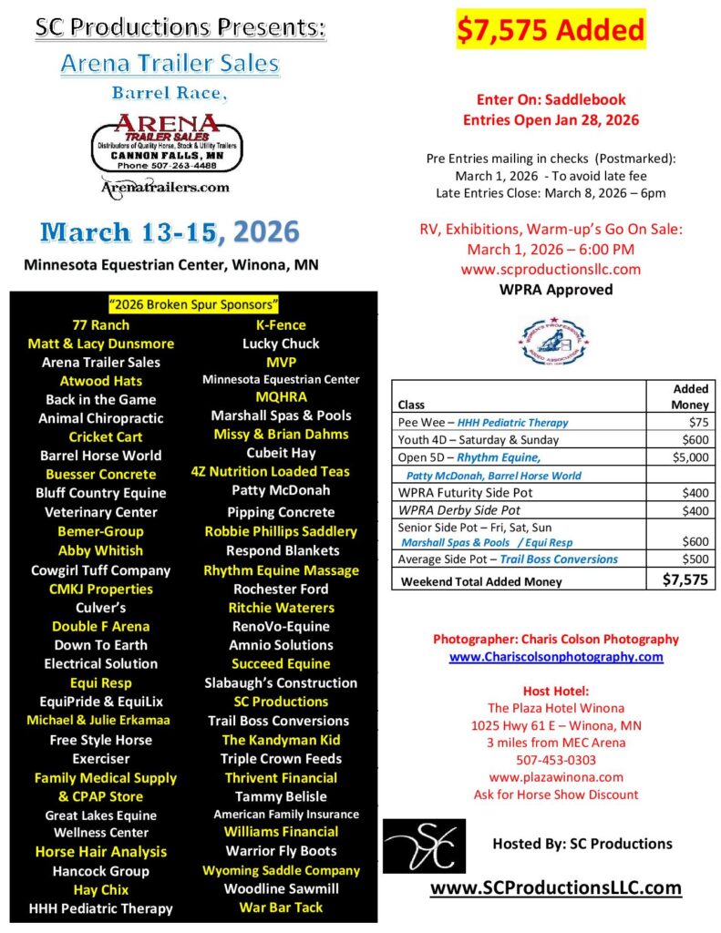 Facebook Event Page “SC Productions Arena Trailer Sales Barrel Race 2026” –Click Here