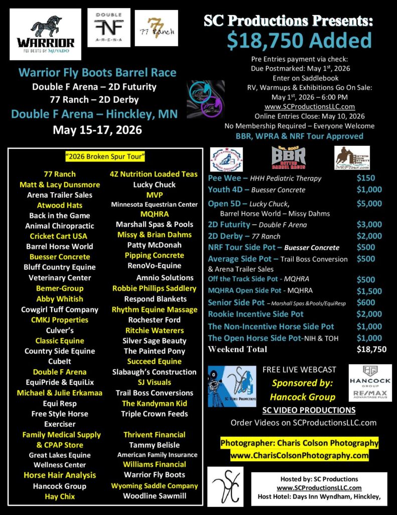 Facebook Event Page – “SC Productions Warrior Fly Boots Barrel Race” – Click Here