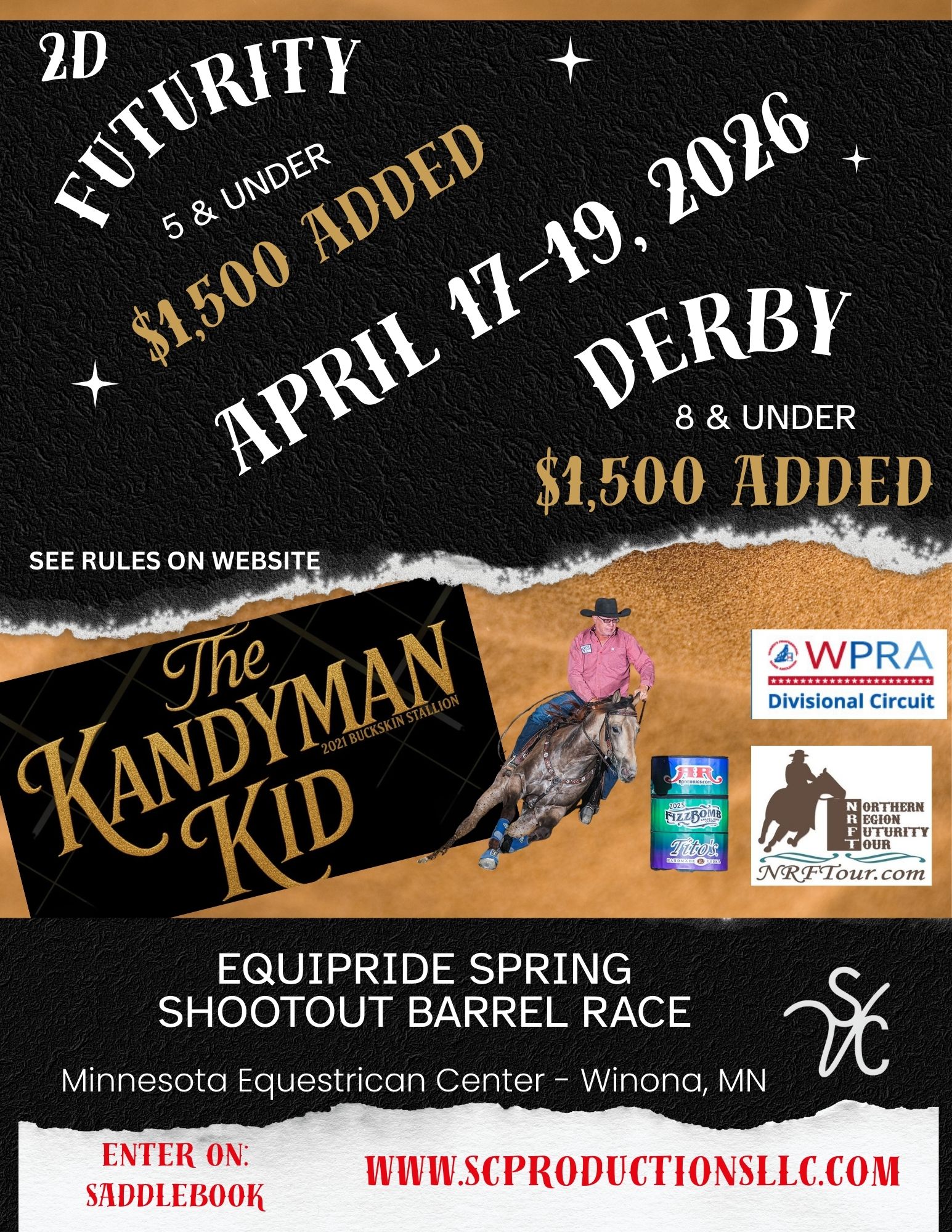 By entering an SC Productions Events, I understand it's my responsiblity to be familiar with and abide by the rules. SC Productions, Sponsors, event facilities are not responsible for any injury, accidents, loss or theft that may occur to You, Your horse,or Your Property while attending this event either as a spectator or contestant. We DO NOT have Emergency Medical Technicians (EMT's) on site during any SC Productions Events.